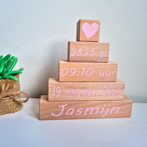 De blokken zijn gemaakt van hout en zijn onbewerkt. De totale stapeltoren heeft een afmeting van 15×15 cm en bestaat uit 5 blokken met verschillende afmetingen. Elk blok is liefdevol bestickerd met de geboortegegevens van het kindje, zoals de naam, geboortedatum, geboortetijd, geboortegewicht. De toren wordt afgemaakt met een leuke, stoere of schattige afbeelding naar keuze. Daarom is dit een uniek en gepersonaliseerd kraamcadeau.