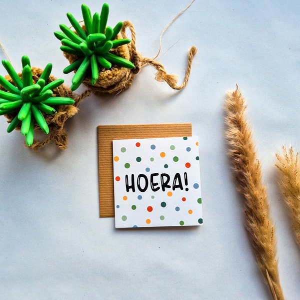 Hoera, er is er één jarig! Een verjaardag is zo’n moment dat vraagt om aandacht, warmte en een persoonlijke boodschap. Deze verjaardagskaart is gemaakt met vrolijke handlettering en de tekst “Hoera!”. Je stuurt niet alleen een felicitatie, maar ook een glimlach. Een kaartje dat past bij elk feestelijk moment en nog lang bewaard mag blijven.